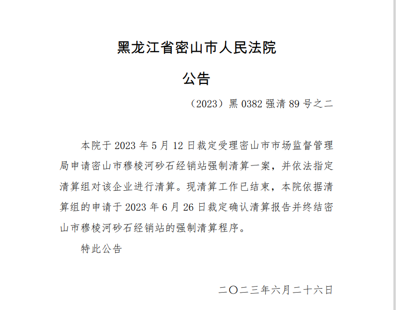 6月26日,黑龍江省密山市人民法院公告,本院于2023年5月12日裁定受理密山市市場監(jiān)督管理局申請密山市穆棱河砂石經(jīng)銷站強制清算一案,并依法指定清算組對該企業(yè)進行清算?,F(xiàn)清算工作已結(jié)束,本院依據(jù)清算組的申請于 2023年6月26日裁定確認(rèn)清算報告并終結(jié)密山市穆棱河砂石經(jīng)銷站的強制清算程序。