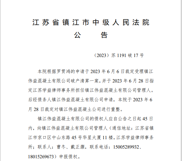 8月4日,江蘇省鎮(zhèn)江市中級人民法院公告,本院于2023年6月6日裁定受理鎮(zhèn)江偉益混凝土有限公司破產(chǎn)清算一案,并于2023年6月28日裁定對鎮(zhèn)江偉益混凝土公司進行重整,本院定于2023年9月28日上午9時30分在本院大法庭通過現(xiàn)場和網(wǎng)絡(luò)直播的方式召開第一次債權(quán)人會議。