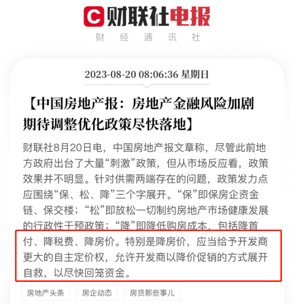 代表官方的中國房地產(chǎn)報(bào)發(fā)文稱:房地產(chǎn)金融風(fēng)險(xiǎn)加劇期待調(diào)整優(yōu)化政策盡快落地。其中提到最重要的一點(diǎn),應(yīng)當(dāng)給予開發(fā)商更大的自主定價(jià)權(quán),允許開發(fā)商以降價(jià)促銷的方式展開自救,以盡快回籠資金。