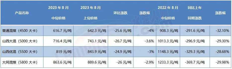 煤價(jià)方面,8月中旬各熱值煤炭價(jià)格同比上年同期,出現(xiàn)了近三成的下跌,全部跌至900元/噸以下。
