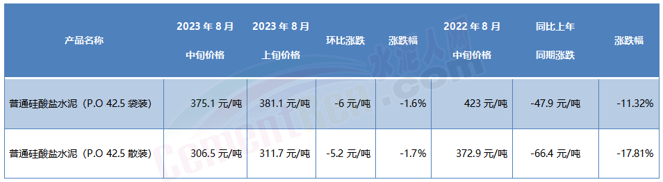 水泥價(jià)格方面,8月中旬流通領(lǐng)域P.O42.5散裝水泥報(bào)價(jià)306.5元/噸,較8月上旬下跌了5.2元/噸,跌幅1.7%。同比2022年8月上旬流通領(lǐng)域P.O42.5散裝水泥報(bào)價(jià)372.9元/噸,下跌了66.4元/噸,跌幅17.81%。