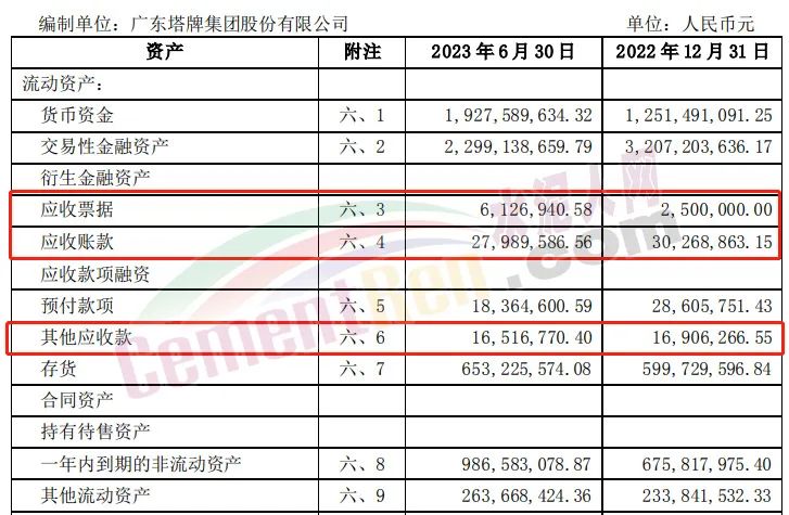 但塔牌集團(tuán)在業(yè)績大比例上升的同時(shí),應(yīng)收票據(jù)增幅也超預(yù)期。塔牌集團(tuán)2023年半年度財(cái)務(wù)報(bào)告中數(shù)據(jù)顯示,應(yīng)收票據(jù)及應(yīng)收賬款3412萬元,同比增長33.18%,其中應(yīng)收票據(jù)612.7萬元,同比增長6026.94%,應(yīng)收賬款2799萬元,同比增長9.69%。
