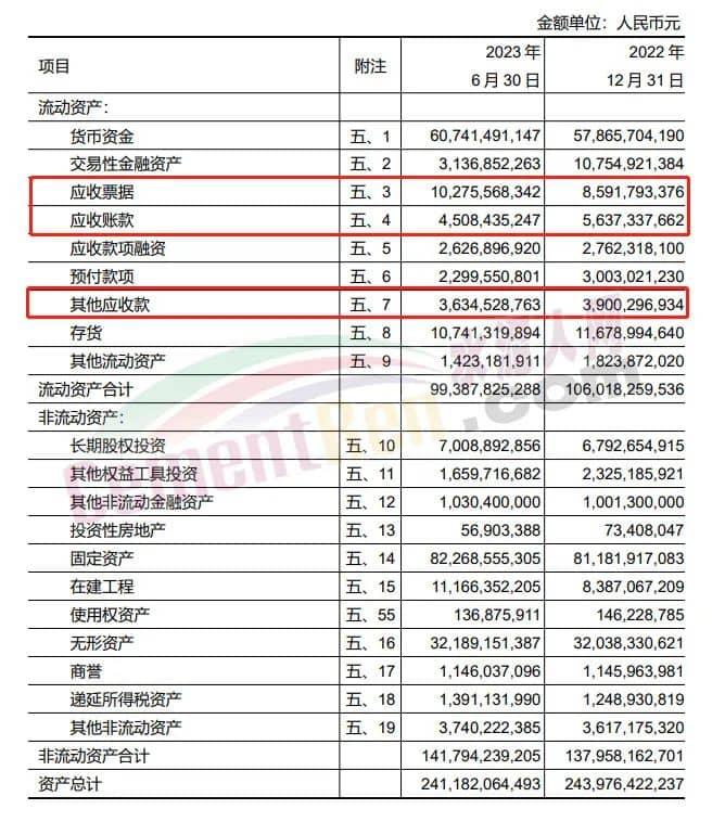 2023年上半年天瑞水泥應(yīng)收賬款2.42億,應(yīng)收票據(jù)96.1億,其他應(yīng)收款3.22億。