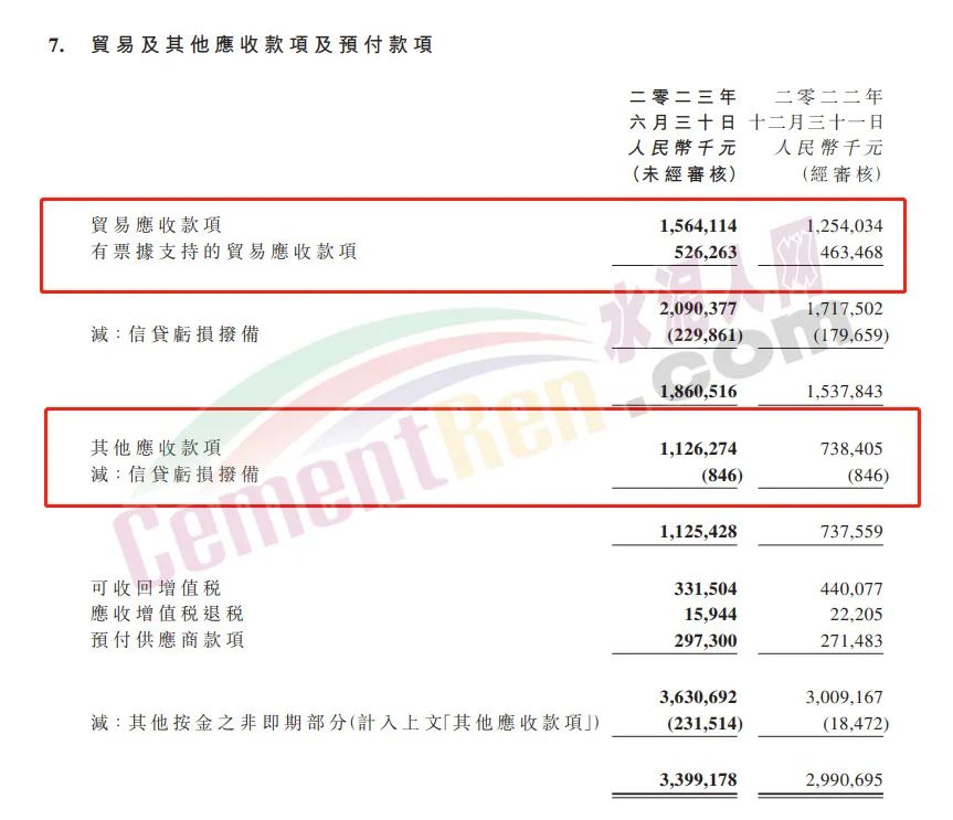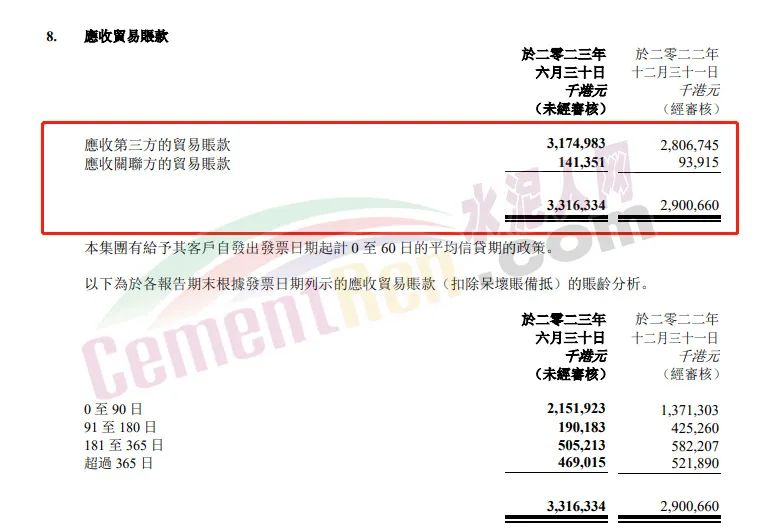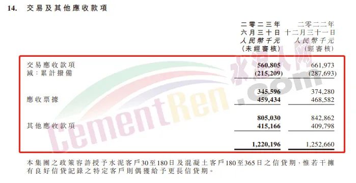 2023年上半年華潤水泥應(yīng)收賬款33.16億。