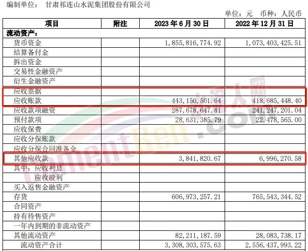 2023年上半年祁連山應(yīng)收賬款4.43億,其他應(yīng)收款384.2萬。