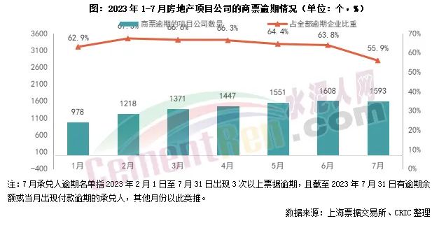 水泥企業(yè)這些票據(jù)賬款中有多少是房地產(chǎn)企業(yè)的,我們無從得知,但是看看房地產(chǎn)行業(yè)的情況就能發(fā)現(xiàn),情況不容樂觀。據(jù)票交所公布的《截至2023年7月31日承兌人逾期名單》,2023年2月末到7月末發(fā)生3次以上商票逾期,且月末有逾期余額或當(dāng)月出現(xiàn)票據(jù)逾期行為的房地產(chǎn)項(xiàng)目公司數(shù)量1593個(gè),占全部商票逾期企業(yè)的比重為55.9%。