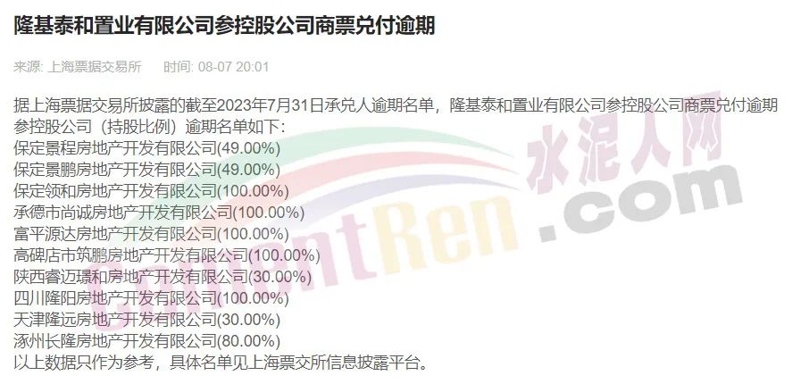 隆基泰和債務(wù)爆雷始于2021年底,旗下隆基泰和置業(yè)出現(xiàn)商票逾期,有10多筆商票拒付。直至今日,隆基泰和置業(yè)仍在上海票交所公布的“持續(xù)逾期名單”中。截至2023年6月30日,隆基泰和置業(yè)有限公司商票逾期5373.35萬元,累計(jì)逾期發(fā)生額6300.44萬元。