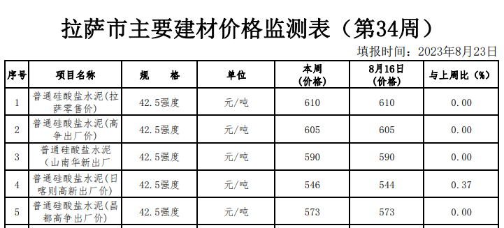 據(jù)來自西藏自治區(qū)發(fā)展和改革委員會價格監(jiān)測中心的數(shù)據(jù)顯示,2023年8月23日西藏拉薩市場42.5強度水泥零售報價610元/噸,高爭、華新出廠價在546-605元/噸不等。