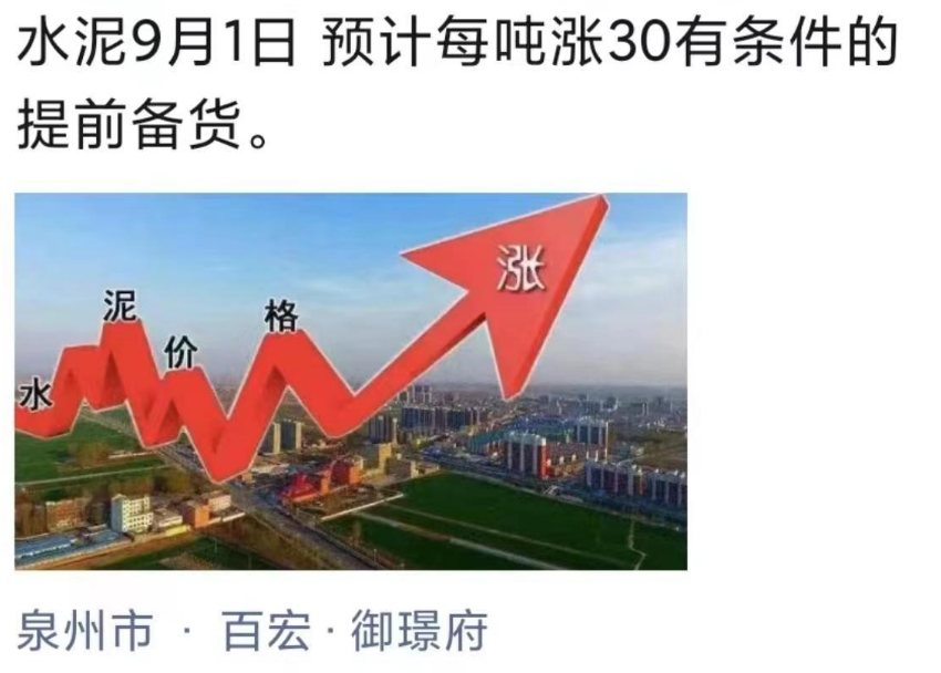 福建泉州經(jīng)銷商通知:9月1日起,預計水泥每噸漲價30元。