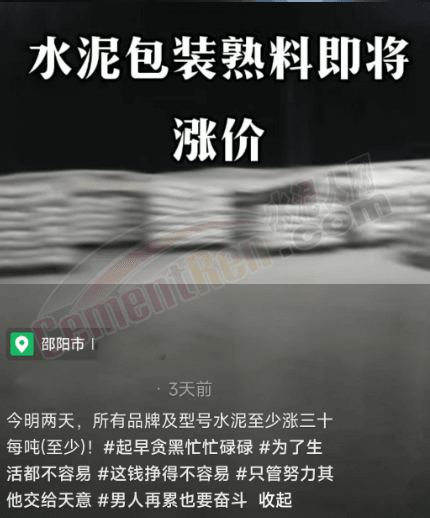 湖南邵陽經(jīng)銷商通知:水泥價格至少漲30元/噸。