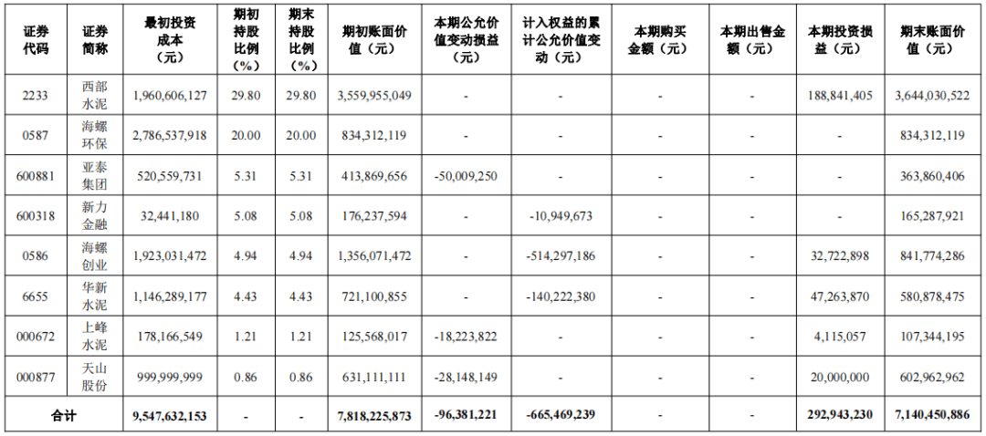 作為水泥行業(yè)的“股神”,海螺水泥在上半年繼續(xù)持有同行西部水泥、亞泰集團、華新水泥、上峰水泥、天山股份等企業(yè)的股份。截至2023年6月末,海螺水泥持有其他上市公司股份情況如下:
