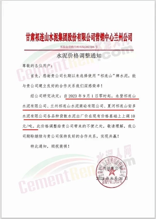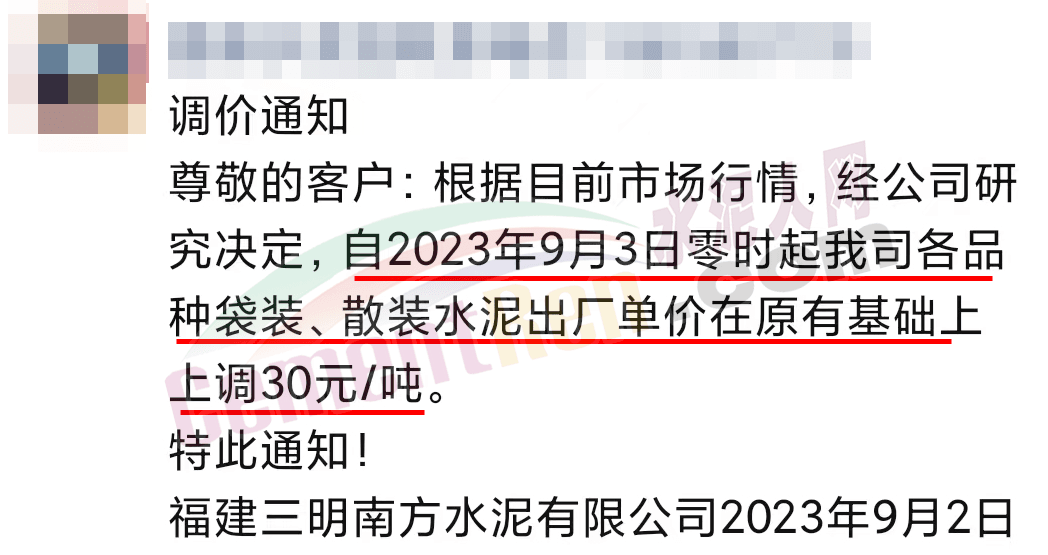 福建三明南方水泥有限公司通知,根據(jù)目前市場(chǎng)行情,經(jīng)公司研究決定,自2023年9月3日零時(shí)起公司各品種袋裝、散裝水泥出廠價(jià)在原有基礎(chǔ)上上調(diào)30元/噸。