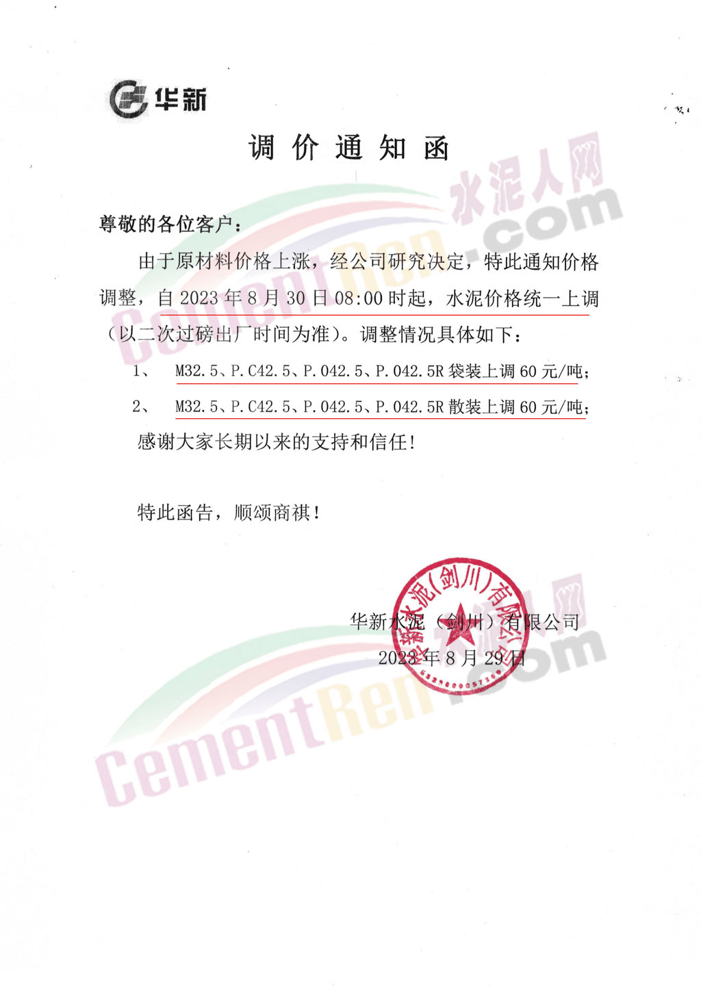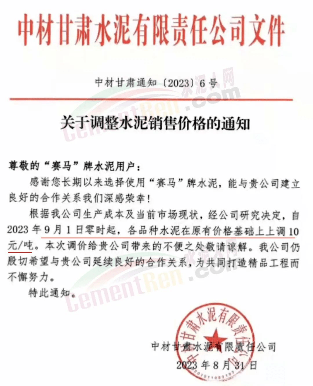 福建省南安市華龍水泥有限公司通知,根據(jù)市場(chǎng)情況,經(jīng)研究決定從2023年9月4日零時(shí)起,發(fā)往福建省內(nèi)各區(qū)域、各品種各規(guī)格型號(hào)水泥在原價(jià)格基礎(chǔ)上上調(diào)30元/噸。
