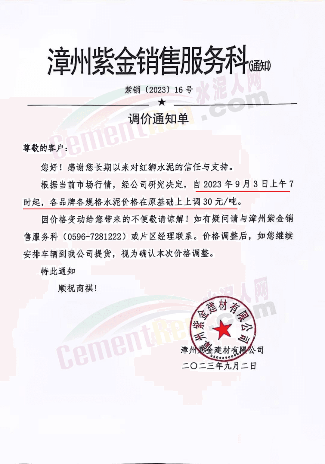 福建省南安市華龍水泥有限公司通知,根據(jù)市場(chǎng)情況,經(jīng)研究決定從2023年9月4日零時(shí)起,發(fā)往福建省內(nèi)各區(qū)域水泥價(jià)格在原價(jià)格基礎(chǔ)上上調(diào)30元/噸。