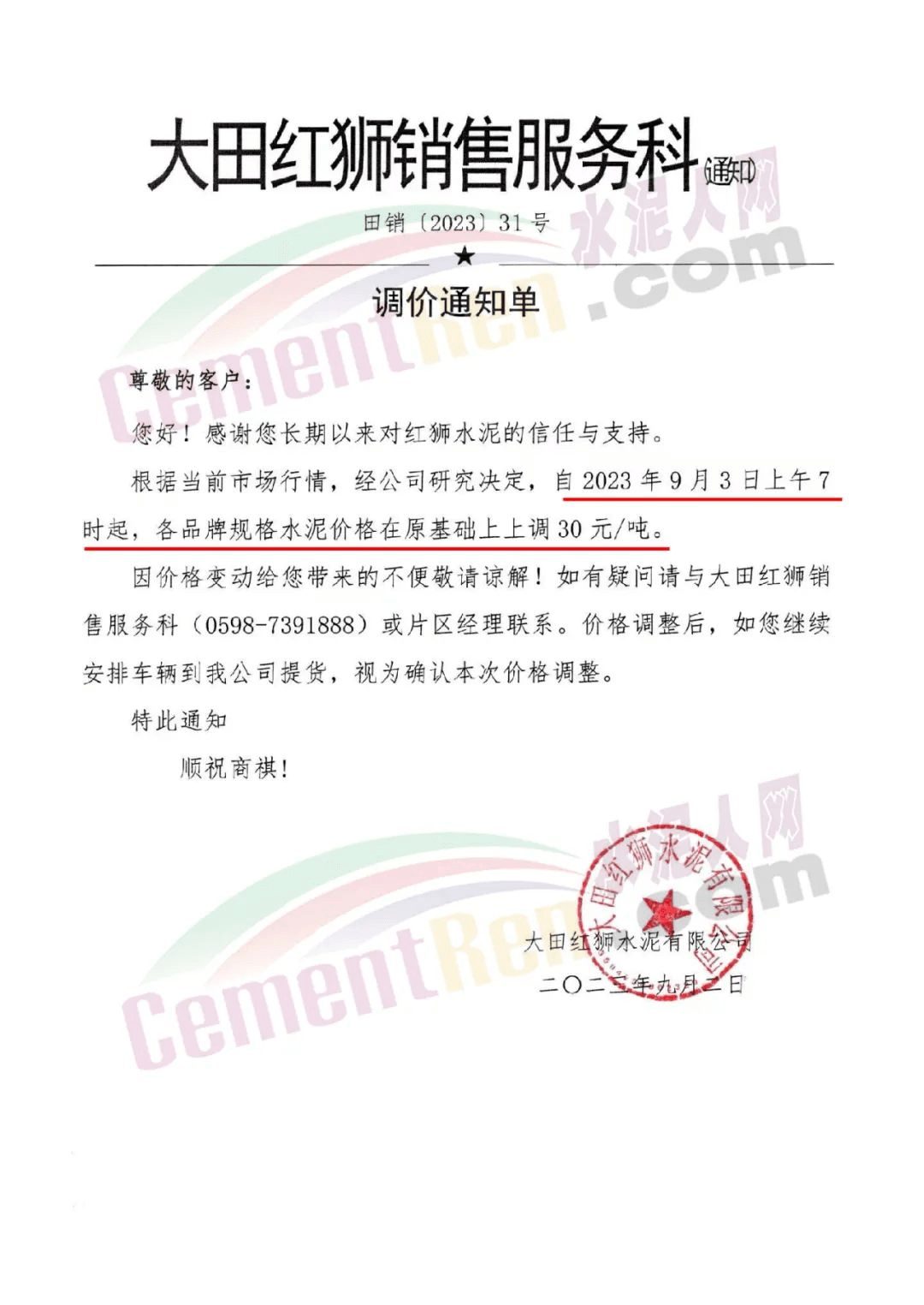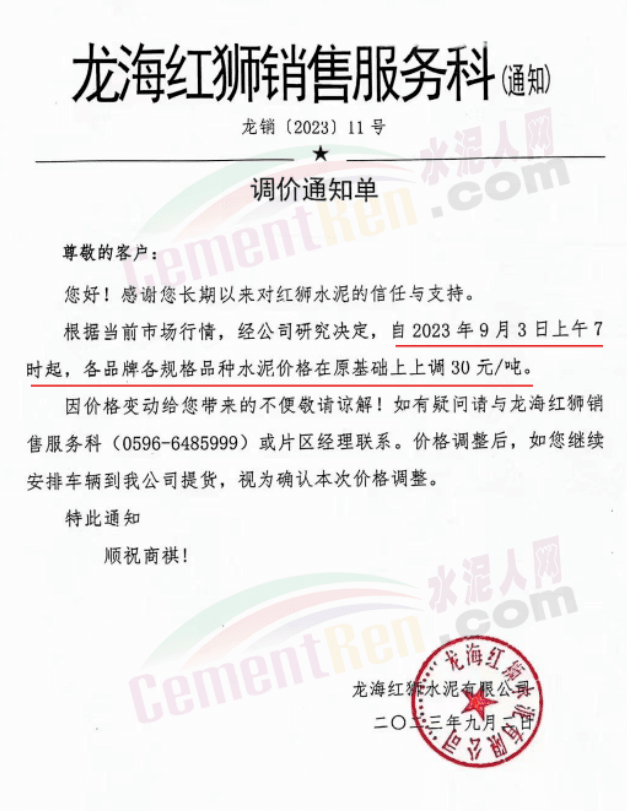 紅獅水泥旗下漳州紫金水泥、龍海紅獅、大田紅獅銷(xiāo)售服務(wù)科通知,根據(jù)當(dāng)前市場(chǎng)行情,經(jīng)公司研究決定,自2023年9月3日上午7時(shí)起,各品牌各規(guī)格品種水泥價(jià)格在原基礎(chǔ)上上調(diào)30元/噸。