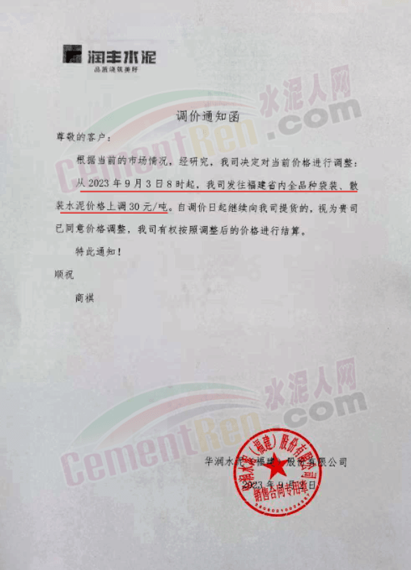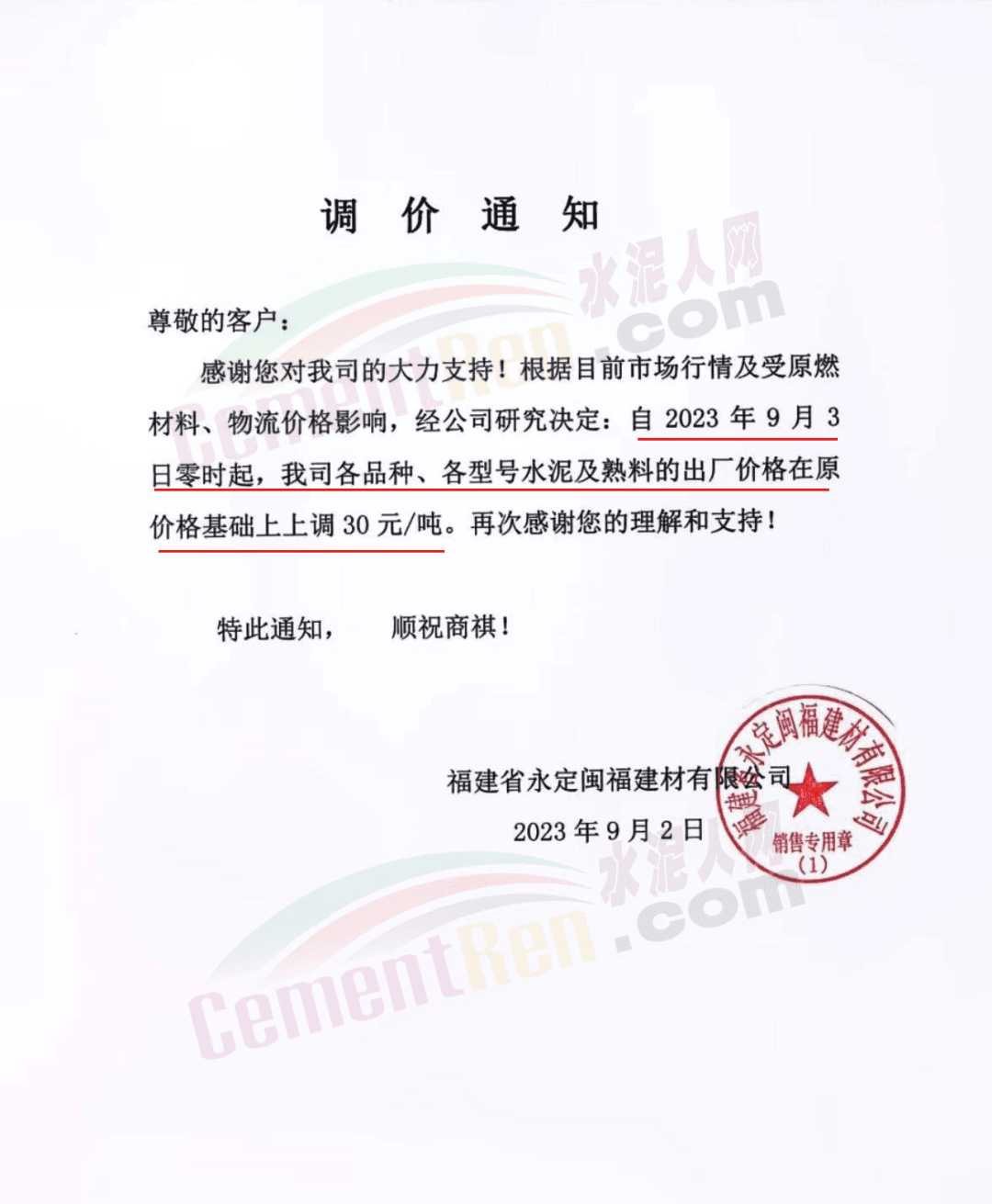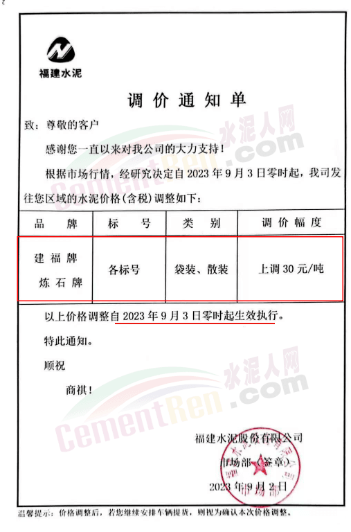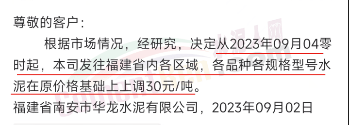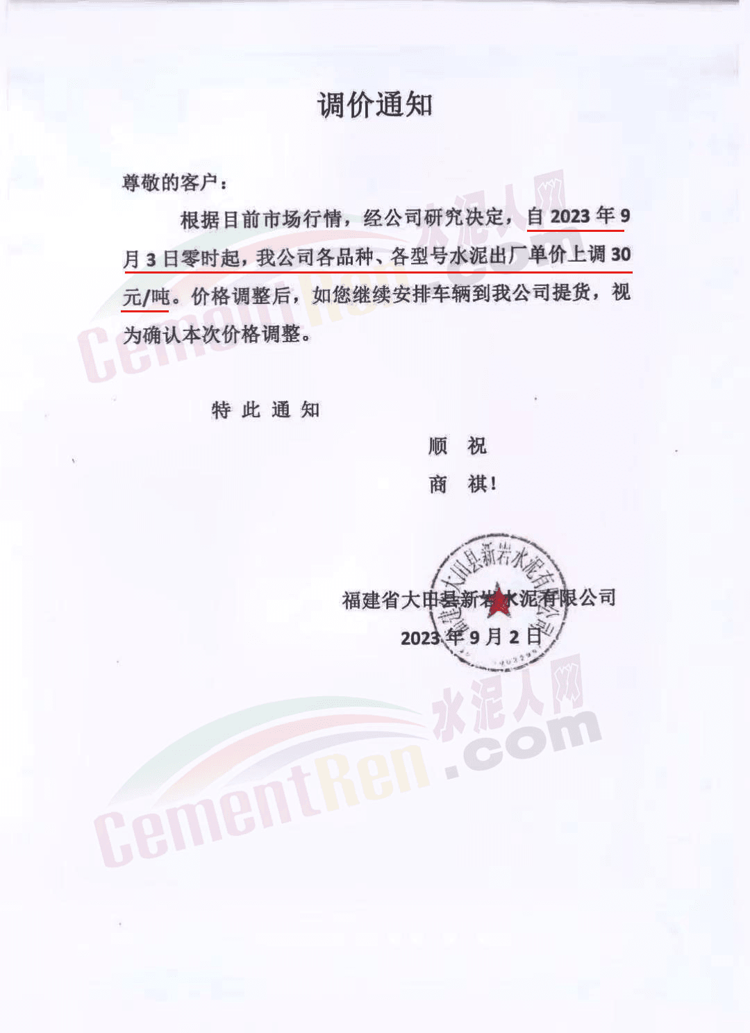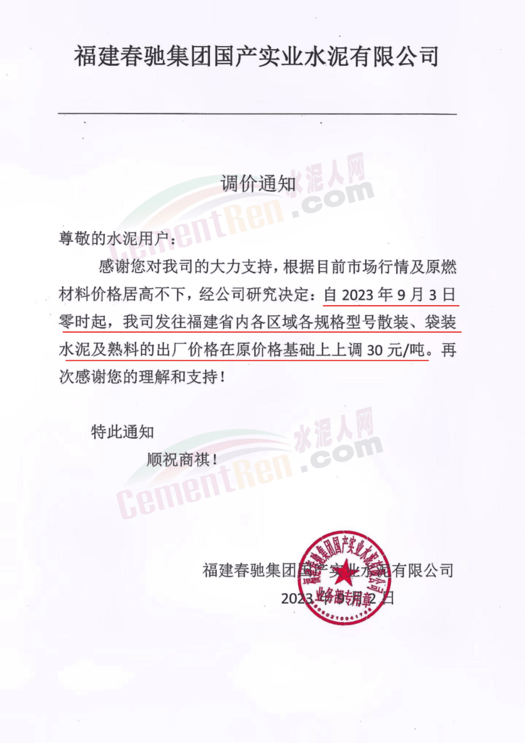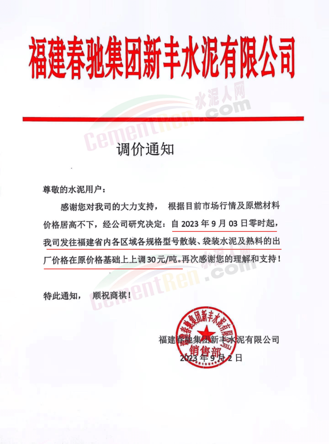 福建三明南方水泥有限公司通知,根據(jù)目前市場(chǎng)行情,經(jīng)公司研究決定,自2023年9月3日0時(shí)起,公司水泥出廠價(jià)在原有基礎(chǔ)上上調(diào)30元/噸。