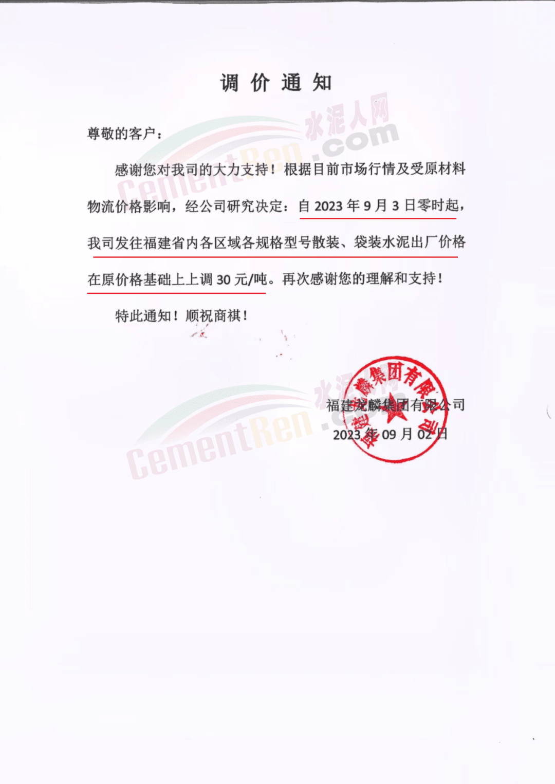 福建龍麟集團(tuán)有限公司通知,根據(jù)目前市場(chǎng)行情及受原材料物流價(jià)格影響,經(jīng)公司研究決定:自2023年9月3日0時(shí)起,公司發(fā)往福建省內(nèi)各區(qū)域各規(guī)格型號(hào)散裝、袋裝水泥出廠價(jià)格在原價(jià)格基礎(chǔ)上上調(diào)30元/噸。