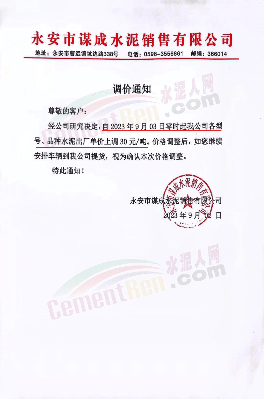 永安市謀成水泥銷(xiāo)售有限公司通知,經(jīng)公司研究決定自2023年9月3日零時(shí)起公司水泥出廠單價(jià)上調(diào)30元/噸。