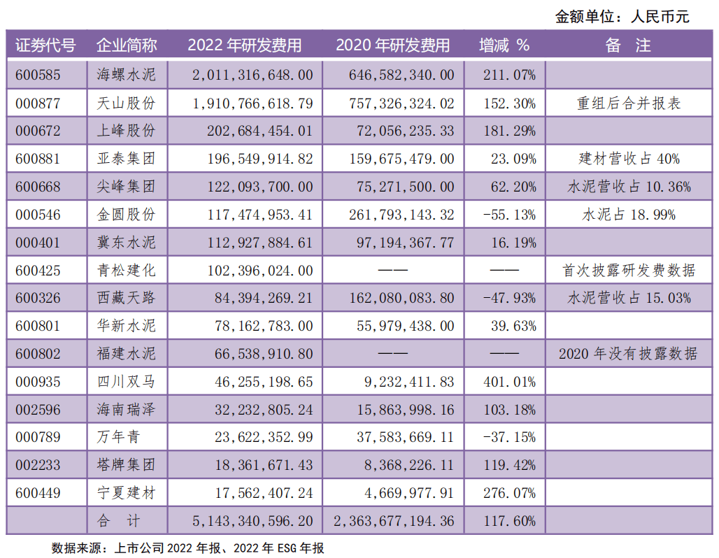表3 水泥A股上市公司2022與2020年企業(yè)研發(fā)費(fèi)用數(shù)據(jù)