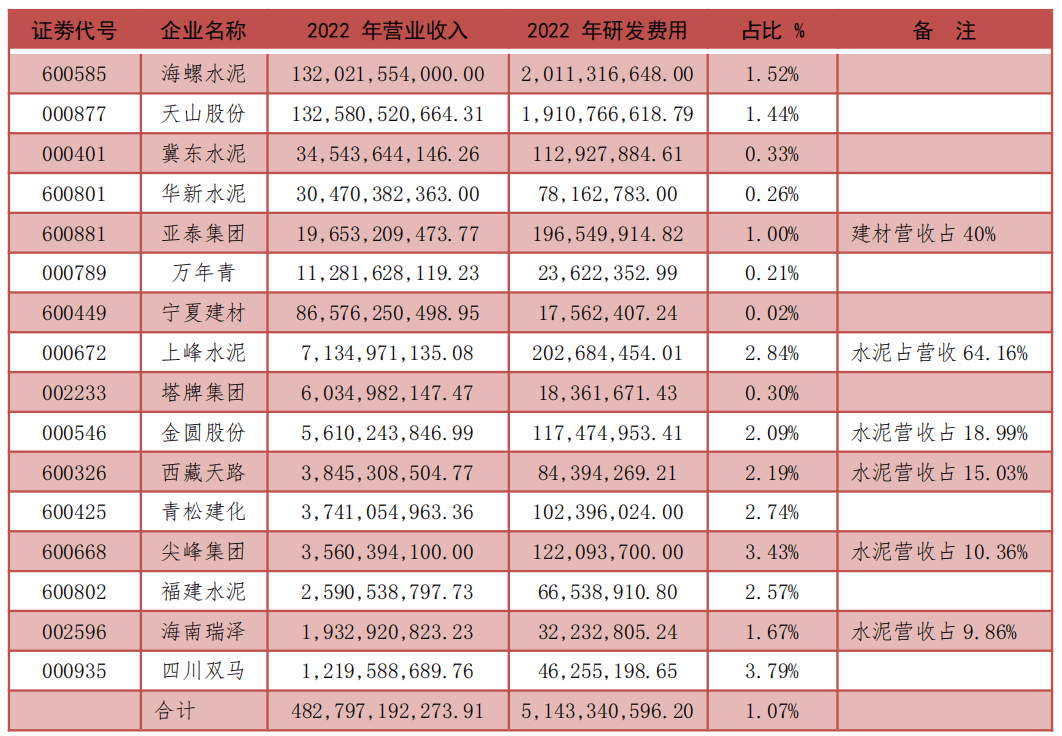 表4 部分水泥上市公司2022年度企業(yè)研發(fā)費(fèi)占比數(shù)據(jù)
