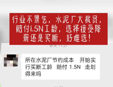 日前,某水泥企業(yè)員工反饋,所在水泥廠為節(jié)約成本,開始實行買斷工齡,賠付1.5N。對于員工而言,是選擇降薪留下還是買斷工齡離職呢?這道選擇題不僅員工難以作答,水泥企業(yè)亦沒有標準答案。