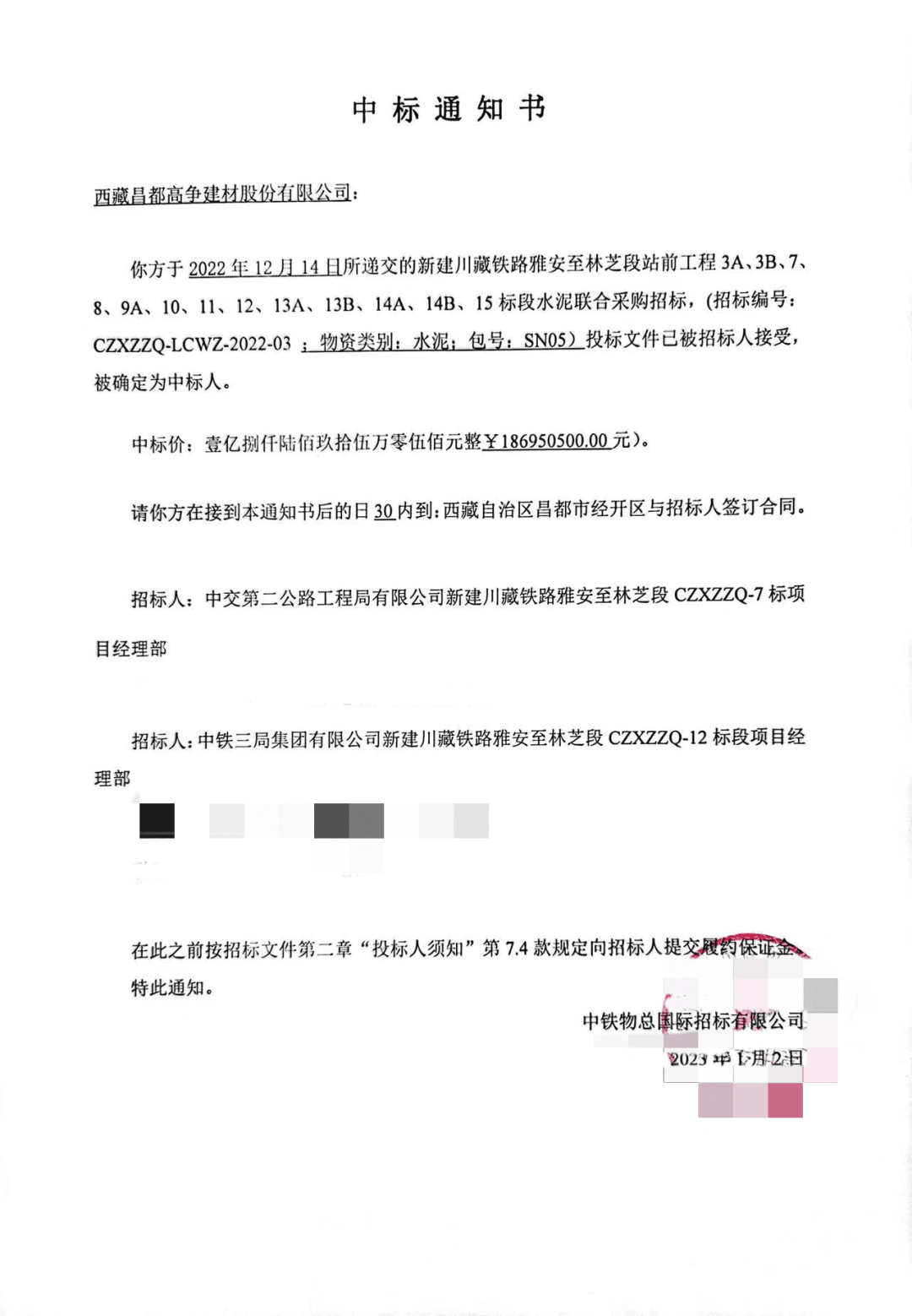 最終,在黨委書記、董事長和領(lǐng)導(dǎo)班子的正確決策、大力支持和各部門的精誠團(tuán)結(jié)、全力配合之下,昌都高爭憑借扎實(shí)的服務(wù)態(tài)度和良好的社會信譽(yù)在激烈的競爭中脫穎而出,順利中標(biāo)川藏鐵路雅安至林芝段工程水泥采購項(xiàng)目,成功獲得水泥供應(yīng)權(quán),中標(biāo)量28萬噸,中標(biāo)金額約1.87億元。