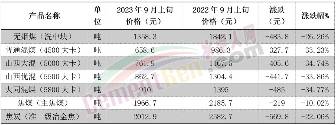 同比上年9月上旬?dāng)?shù)據(jù),4500大卡到5800大卡煤炭價格全部為下跌,其中5800大卡煤炭下跌達(dá)485元/噸。5000大卡煤炭下跌405.6元/噸。