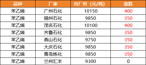 9月以來,苯乙烯漲超1000元/噸,期貨市場日內(nèi)大漲3.45%,多家化工企業(yè)苯乙烯出廠價大漲350-400元/噸,廣州石化和茂名石化出廠價已漲破10000元/噸。