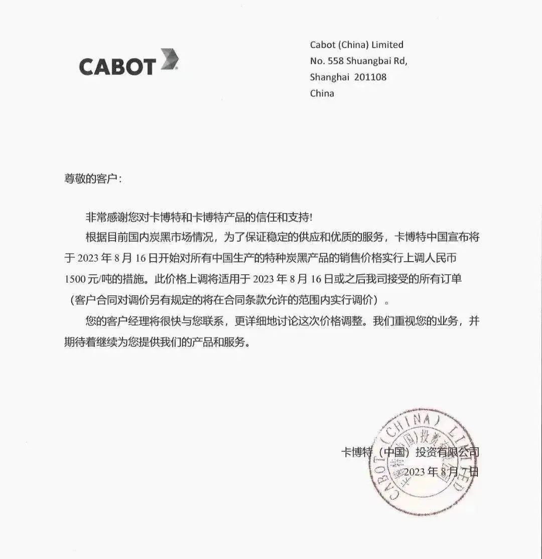 8月份開始,炭黑價格觸底反彈。目前橡膠用炭黑價格已經(jīng)突破一萬大關(guān),且還呈現(xiàn)往上飆升的態(tài)勢。2023年9月15日炭黑價格為11000元/噸左右,并且還有繼續(xù)上漲之勢。炭黑龍頭卡博特宣布對所有中國生產(chǎn)的特種炭黑產(chǎn)品的銷售價格實(shí)行上調(diào)人民幣1500元/噸。