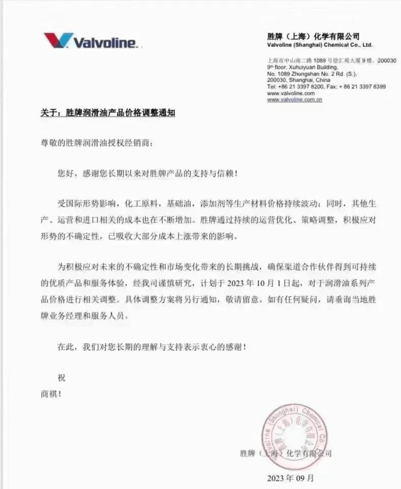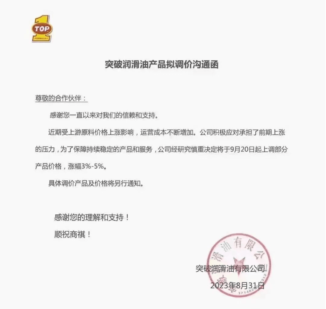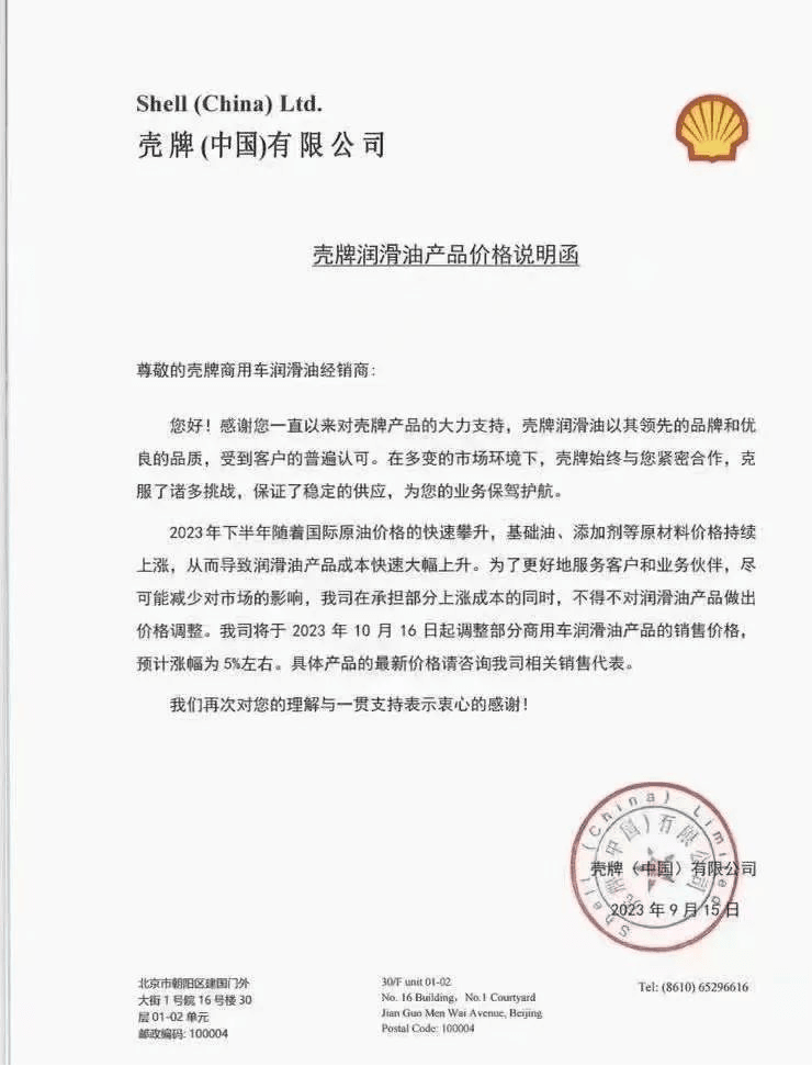 近日,勝牌、殼牌和突破潤滑油發(fā)布了關(guān)于調(diào)整潤滑油產(chǎn)品價格通告,宣布對產(chǎn)品價格進(jìn)行適度上調(diào),預(yù)計漲幅為5%左右。