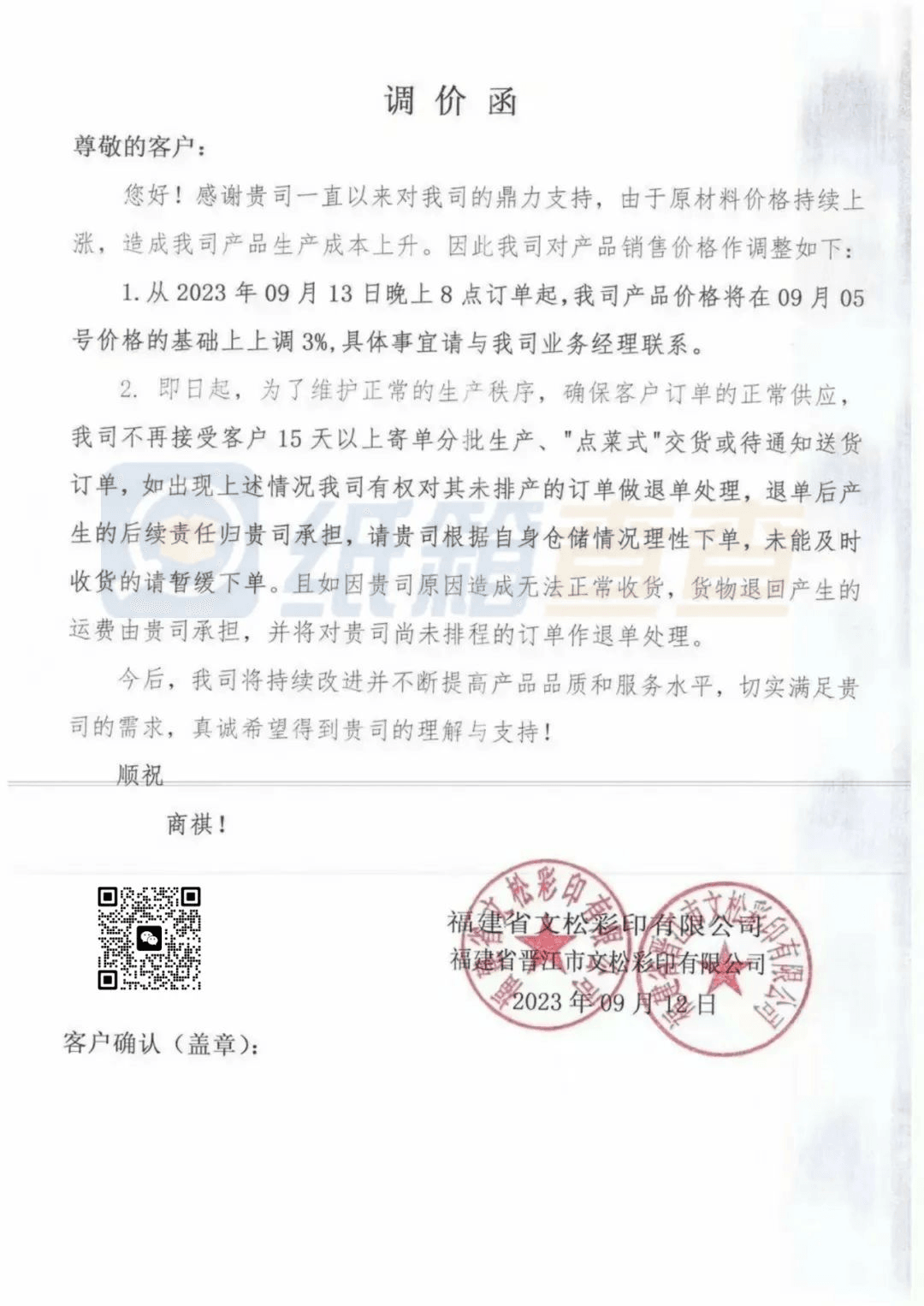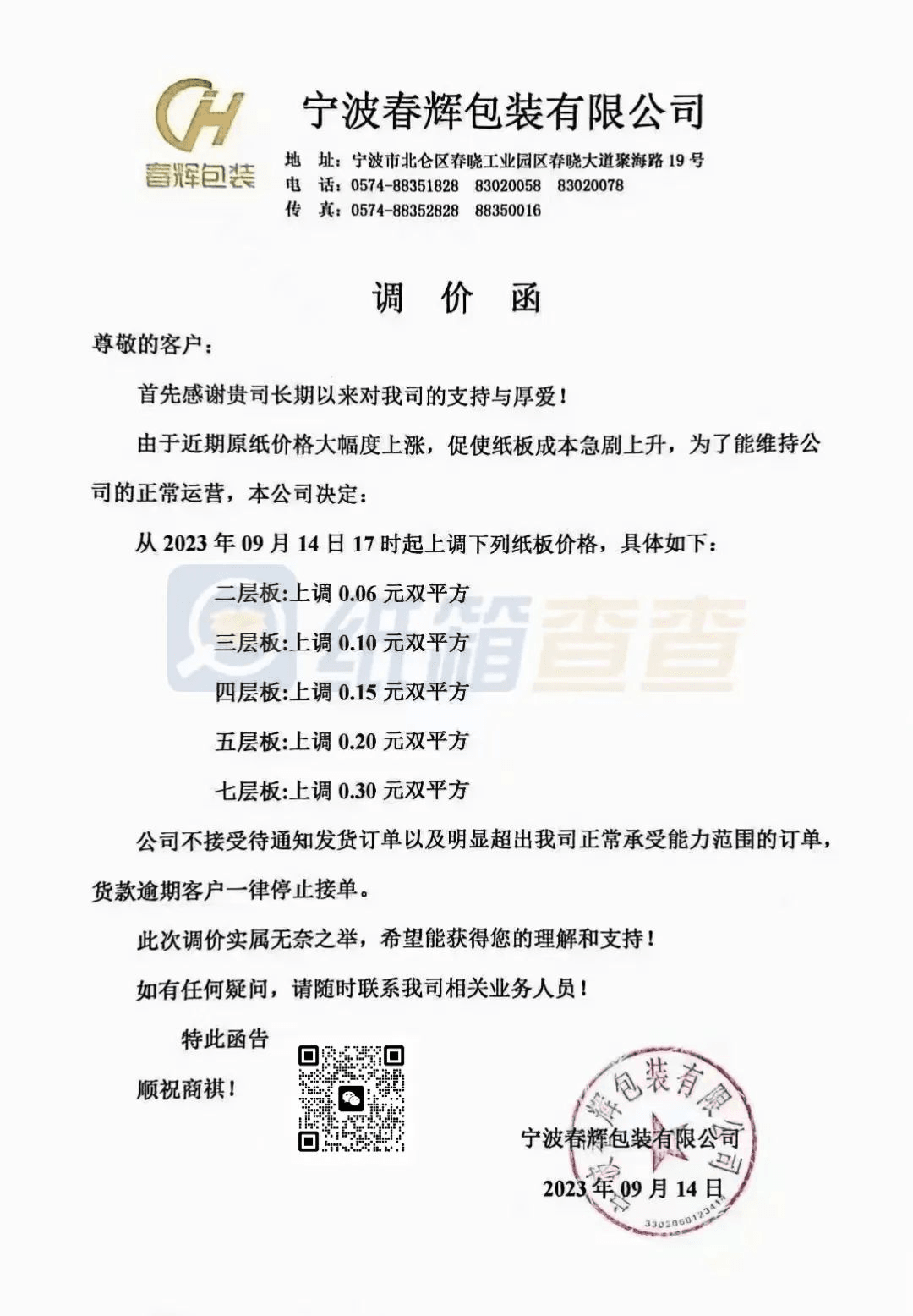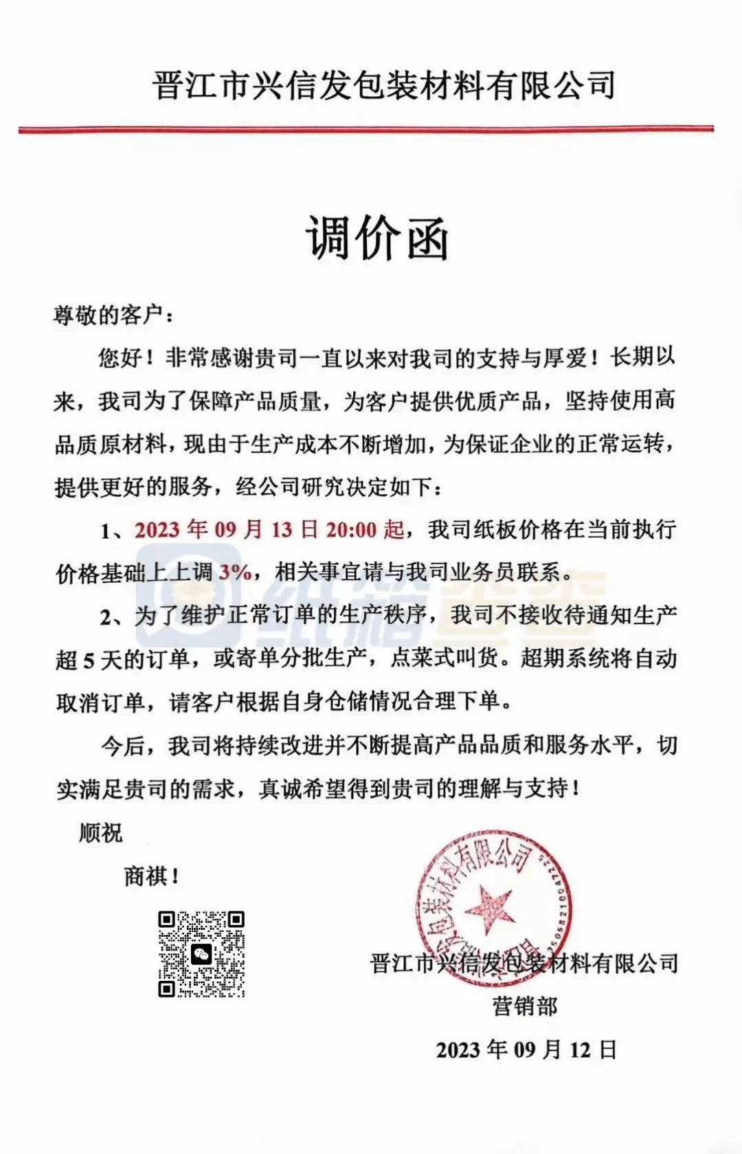南安市恒發(fā)紙品包裝:從2023年9月13日20時起,產(chǎn)品銷售價格在原有價格基礎(chǔ)上上調(diào)3%。