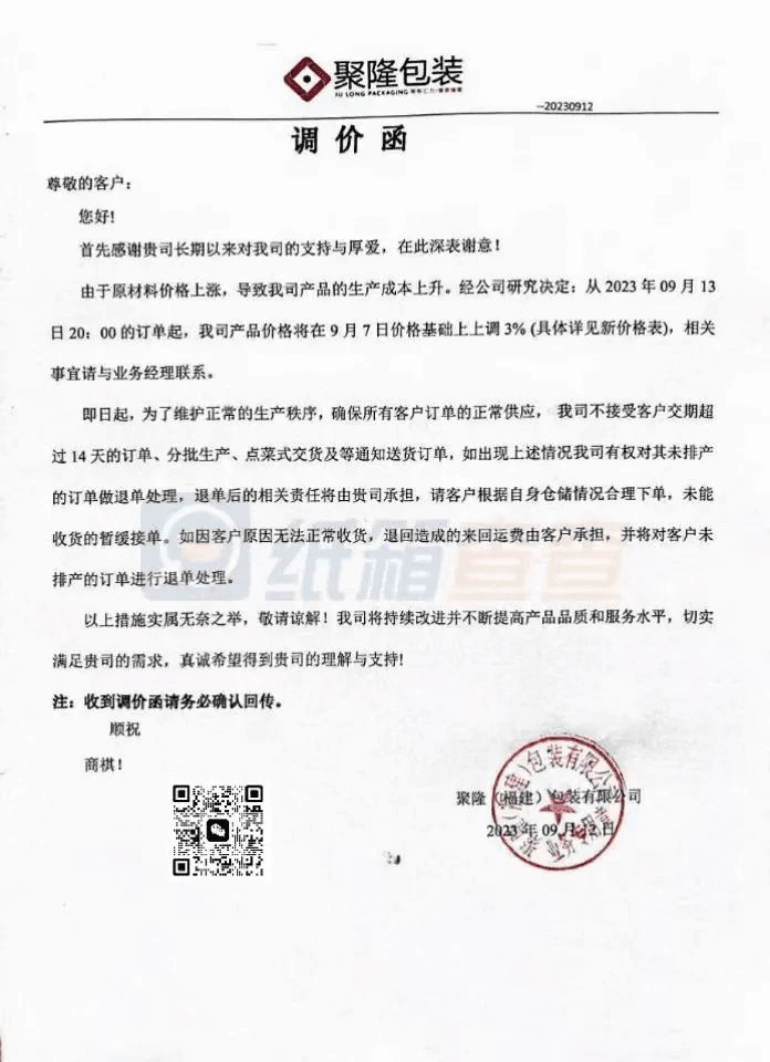 聚隆(福建)包裝:從2023年9月13日20:00的訂單起,將在9月7日價格基礎(chǔ)上上調(diào)3%。