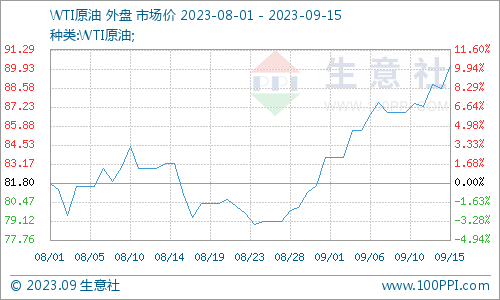 沙特持續(xù)減產(chǎn),今年第四季度全球石油市場將面臨每天超過300萬桶的供應(yīng)缺口,9月14日,國際原油期貨上漲,漲幅明顯。美國WTI原油期貨主力合約結(jié)算價報90.16美元/桶,漲幅1.64美元或1.9%。今年WTI首次站上90美元關(guān)口,創(chuàng)2022年11月以來新高。8月23日以來,WTI原油價格階段性大漲14.4%。