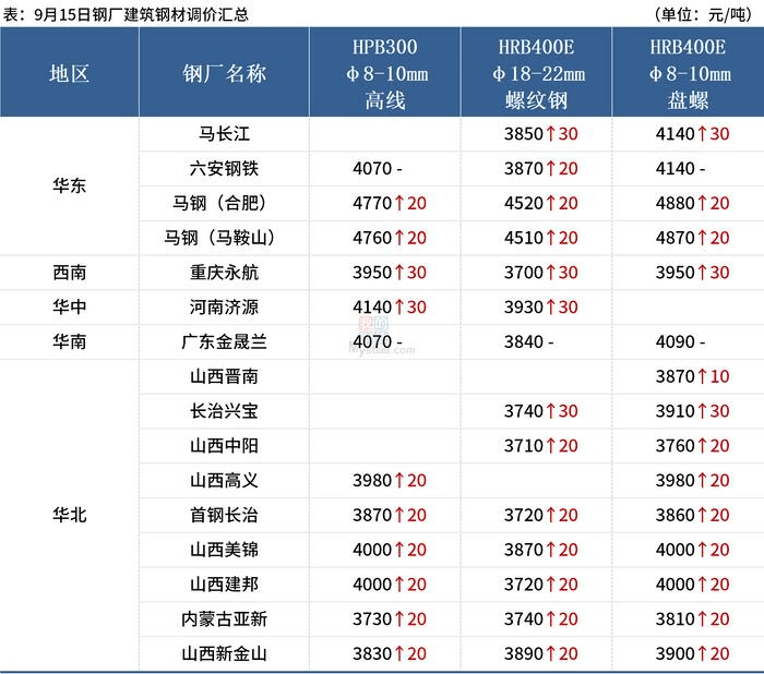 上周五(9月15日),全國累計15家鋼廠發(fā)布調(diào)價信息,其中14家鋼廠漲價,整體調(diào)幅在0-30元/噸。