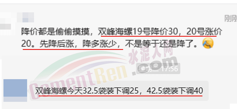 當(dāng)?shù)匾唤?jīng)銷(xiāo)商反饋稱(chēng),“雙峰海螺19日降價(jià)30元/噸,20日又通知漲價(jià)20元/噸。先降后漲,降多漲少,漲也是降啊!”