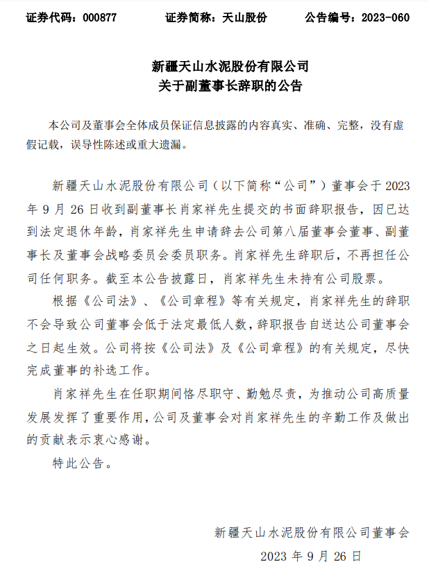 天山股份9月26日晚間發(fā)布公告稱,新疆天山水泥股份有限公司董事會(huì)于2023年9月26日收到副董事長(zhǎng)肖家祥先生提交的書(shū)面辭職報(bào)告,因已達(dá)到法定退休年齡,肖家祥先生申請(qǐng)辭去公司第八屆董事會(huì)董事、副董事長(zhǎng)及董事會(huì)戰(zhàn)略委員會(huì)委員職務(wù),不再擔(dān)任公司任何職務(wù)。