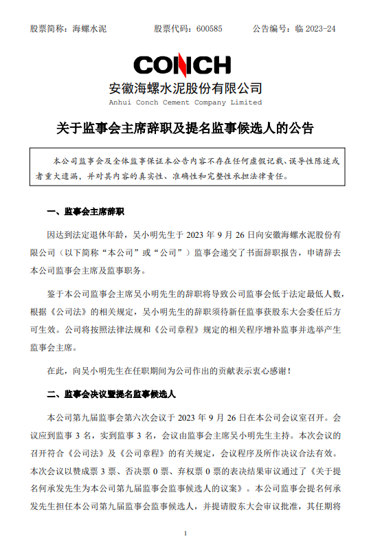海螺水泥公告稱,因達(dá)到法定退休年齡,吳小明先生于2023年9月26日向安徽海螺水泥股份有限公司監(jiān)事會(huì)遞交了書(shū)面辭職報(bào)告,申請(qǐng)辭去本公司監(jiān)事會(huì)主席及監(jiān)事職務(wù)。