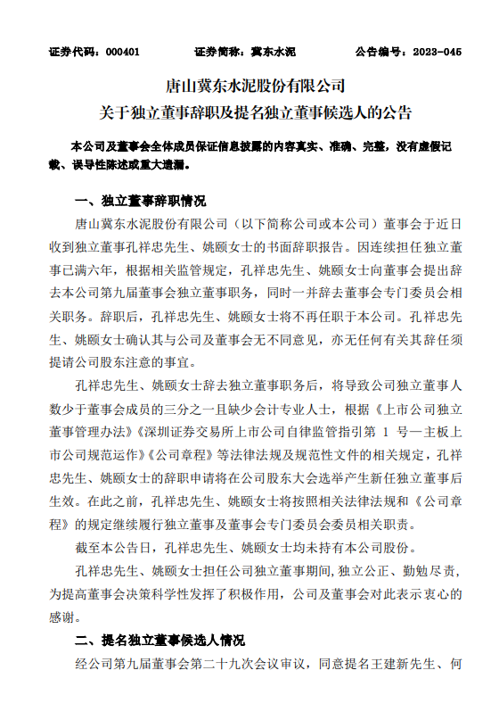 冀東水泥獨(dú)立董事孔祥忠先生、姚頤女士辭職,王建新先生、何捷女士將接任