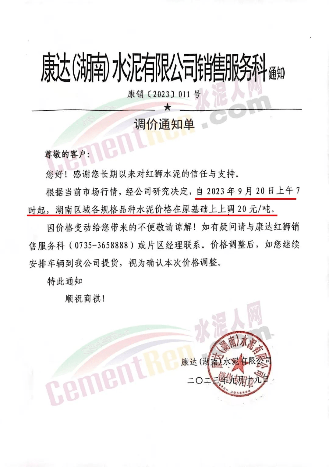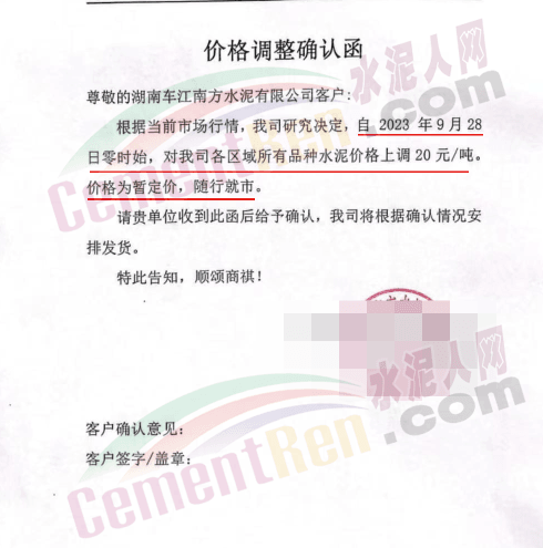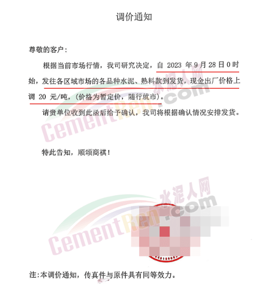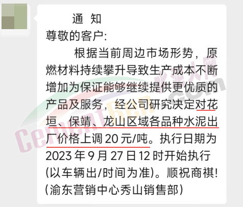 日前,重慶某品牌水泥渝東營銷中心秀山銷售部通知,根據(jù)周邊市場形勢,原燃材料持續(xù)攀升導(dǎo)致生產(chǎn)成本不斷增加,經(jīng)公司研究決定從2023年9月27日12時(shí)開始對花垣、保靖、龍山區(qū)域各品種水泥出廠價(jià)格上調(diào)20元/噸。