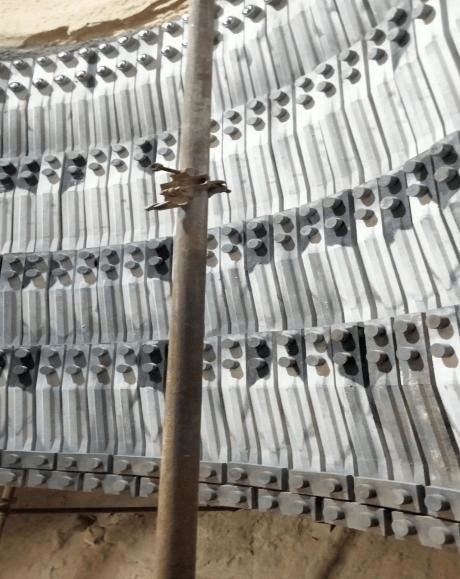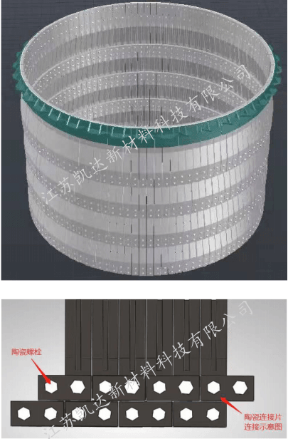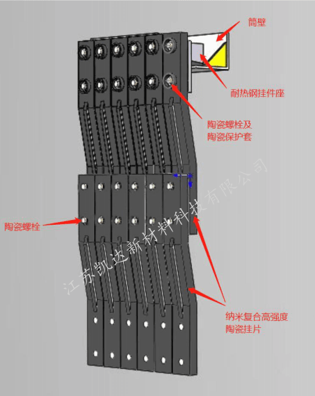 采用多種陶瓷復(fù)合材料,經(jīng)過(guò)1800℃左右高溫?zé)Y(jié)而成,使用溫度可達(dá)1500℃。具有耐高溫、抗沖刷、耐腐蝕、抗結(jié)皮、抗震性穩(wěn)定、重量輕、施工安裝方便。結(jié)構(gòu)上,掛片與底座采用特種高溫耐腐螺栓鏈接,耐熱鋼螺帽的外部采用碳化硅陶瓷保護(hù)套家耐火膠泥進(jìn)行保護(hù);底座與掛條之間加多晶棉,翻盤(pán)華處理,是安裝結(jié)構(gòu)更為合理;掛片底部采用陶瓷螺栓與陶瓷鏈接板進(jìn)行雙鏈接,使其整合內(nèi)筒更加牢固。