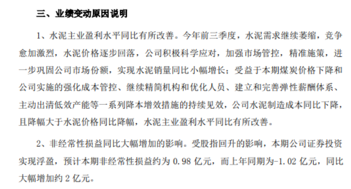 公司業(yè)績預(yù)增原因中提及受益于煤炭價格下降和公司實施的強化成本管控、繼續(xù)精簡機構(gòu)和優(yōu)化人員、建立和完善彈性薪酬體系、主動出清低效產(chǎn)能等一系列降本增效措施的持續(xù)見效,公司水泥制造成本同比下降,且降幅大于水泥價格同比降幅,水泥主業(yè)盈利水平同比有所改善。