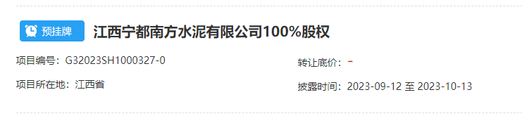 日前,江西南方水泥有限公司100%控股企業(yè)江西寧都南方水泥有限公司100%股權(quán)在某交易平臺公布預(yù)掛牌。