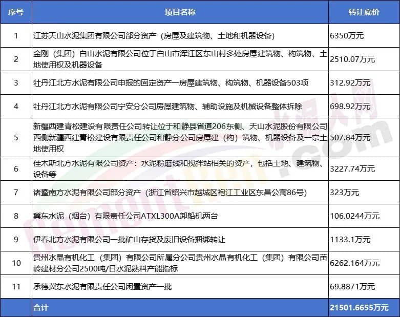多家水泥企業(yè)出售廢舊資源、低效資產(chǎn)及股票、債權(quán)