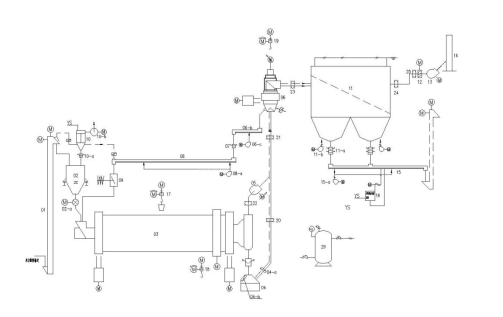 球磨機(jī)〔03〕的通風(fēng)依靠變頻調(diào)速電機(jī)帶動(dòng)的離心風(fēng)機(jī)〔05〕送入選粉機(jī)一次風(fēng)管。