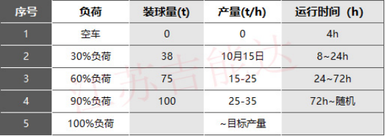 試車階段時(shí)間(h)裝球量(t)產(chǎn)量(t/h)(由吉能達(dá)公司現(xiàn)場人員調(diào)配)