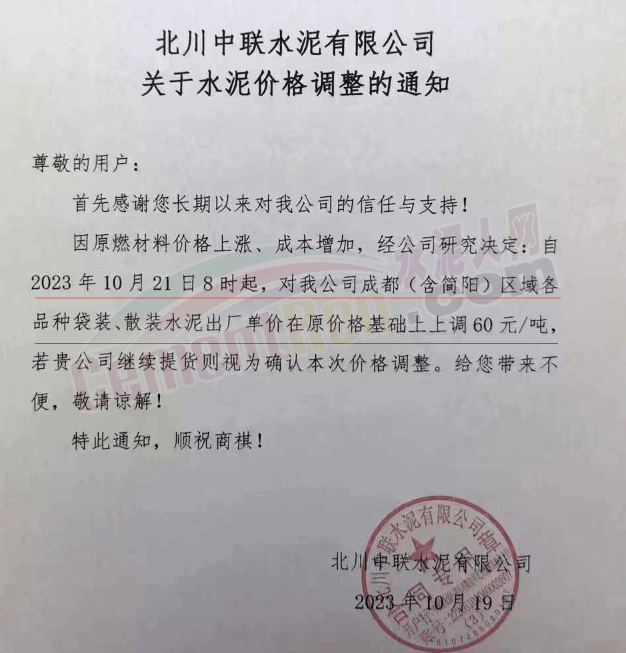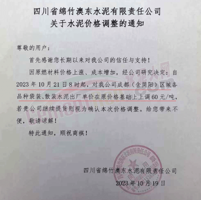 水泥人網(wǎng)通訊員消息:日前,四川大成都區(qū)域主要品牌企業(yè)通知自2023年10月21日起上調(diào)各品種水泥出廠價60元/噸。