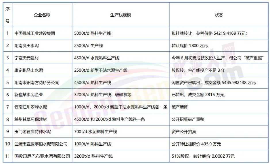 與此同時,多家水泥企業(yè)股權(quán)、指標、設(shè)備資產(chǎn)登上拍賣平臺。其中不乏2500t/d及以上規(guī)格熟料生產(chǎn)線,甚至還包含5000t/d生產(chǎn)線。
