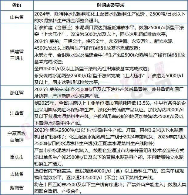 據(jù)水泥人網(wǎng)近期消息,繼山東省出臺計劃,明確2500t/d及以下水泥熟料生產(chǎn)線退出的時間后,福建、浙江、吉林、江西、寧夏、湖南多地也發(fā)布了2500t/d及以下水泥熟料生產(chǎn)線退出的時間表。