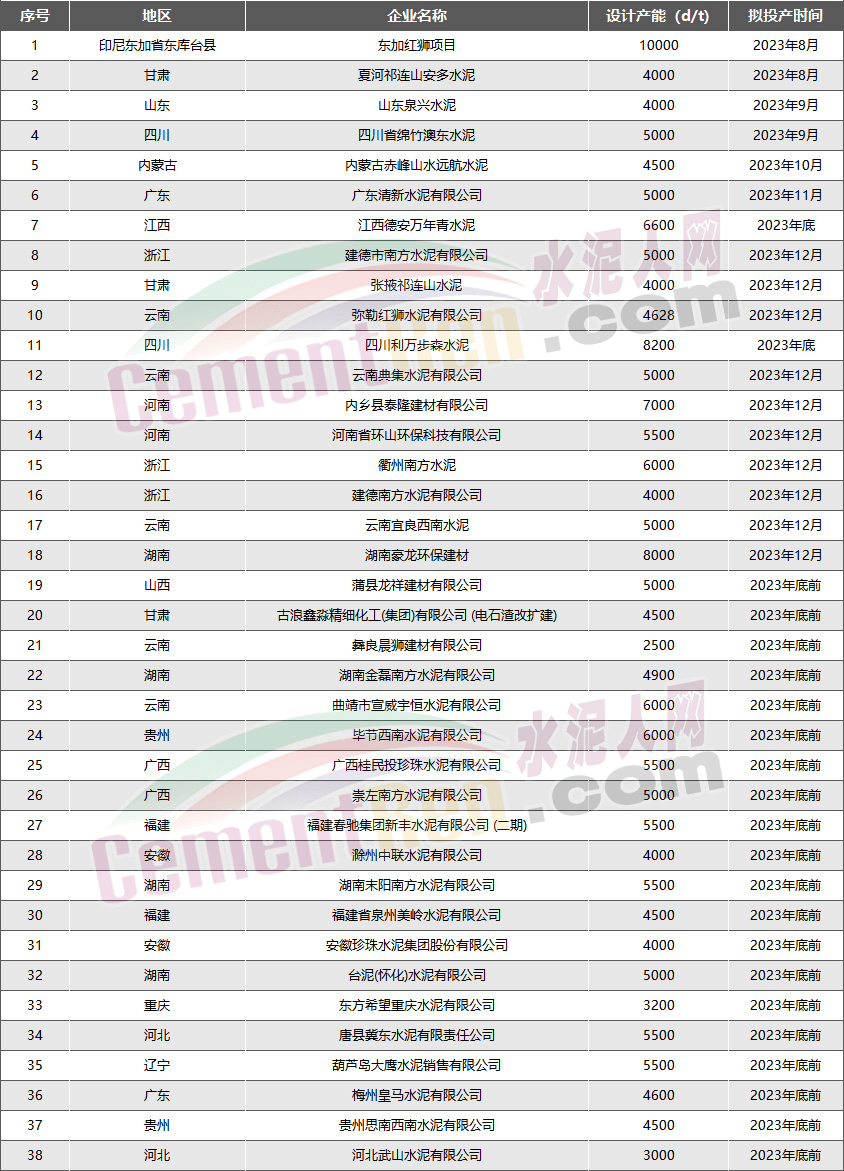 10月19日江西省工信廳分別發(fā)布宜春紅獅水泥和分宜海螺水泥兩條4500t/d熟料生產(chǎn)線的置換公示,紅獅水泥為補齊產(chǎn)能,分宜海螺為拆二建一。據(jù)水泥人網(wǎng)不完全統(tǒng)計,在此前通過的置換方案中計劃于2023年內(nèi)點火投產(chǎn)的水泥熟料生產(chǎn)線項目達38條。