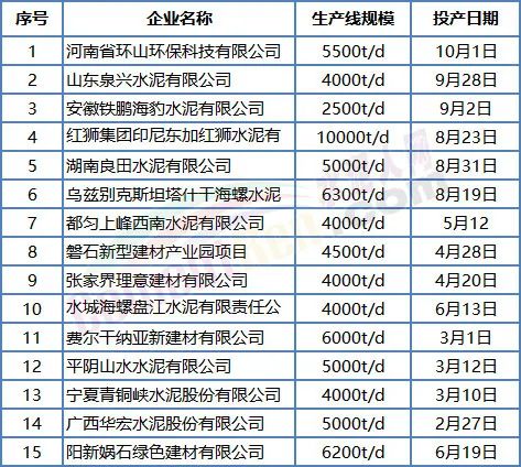 從目前各項目最新動態(tài)可見,部分在建項目已陸續(xù)點火投產(chǎn),另有部分已開工在建項目正加緊建設(shè)中。據(jù)不完全統(tǒng)計已投產(chǎn)的15個熟料項目,合計產(chǎn)能達2280萬噸/年;下半年將投產(chǎn)的5個項目合計產(chǎn)能達810萬噸/年,合計產(chǎn)能達3090萬噸/年。